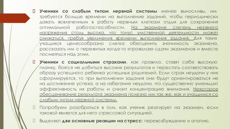 Ученики с социальными страхами, как правило, ставят себе высокую планку, боятся не добиться высоких результатов и перестать соответствовать образу успешного ребенка успешных родителей. Если страх неудачи у них сформируется, то при выполнении задания они будут ориентироваться не на достижение успеха, а на избегание неудачи, что существенно уменьшит эффективность их работы и снизит концентрацию внимания. Некоторое обесценивание результата экзамена полезно им так же, как и учащимся со слабым типом нервной системы.