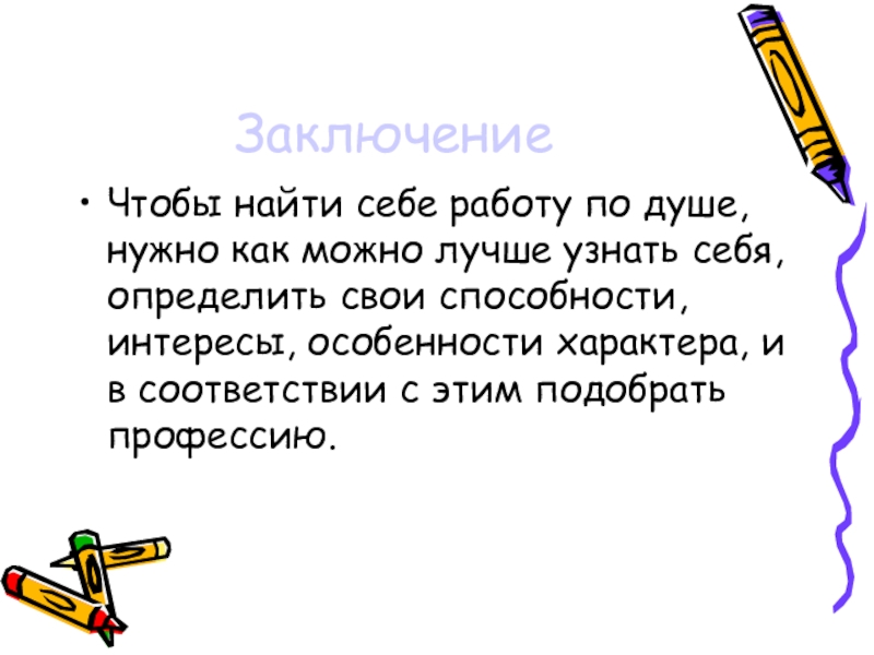 ЗаключениеЧтобы найти себе работу по душе, нужно как можно лучше узнать себя, определить свои способности, интересы, особенности