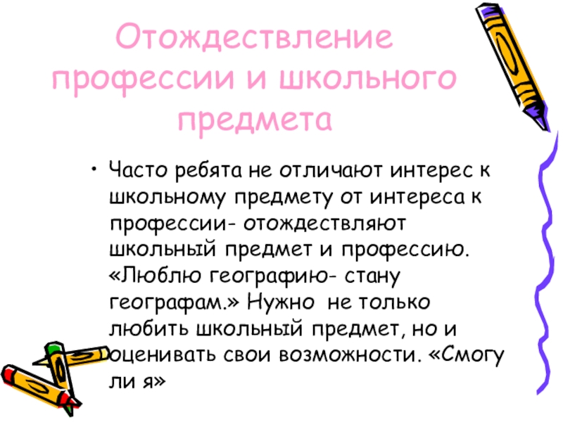 Отождествление профессии и школьного предметаЧасто ребята не отличают интерес к школьному предмету от интереса к профессии- отождествляют