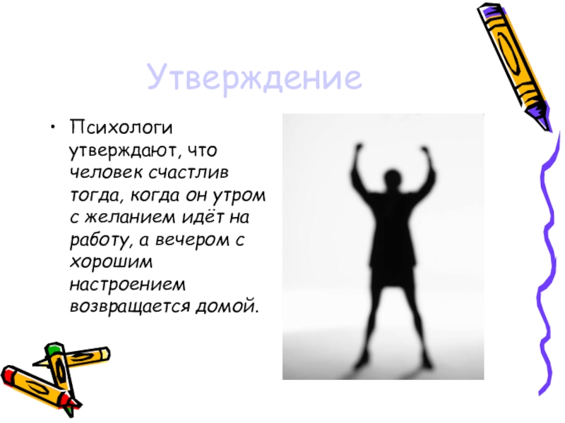 УтверждениеПсихологи утверждают, что человек счастлив тогда, когда он утром с желанием идёт на работу, а вечером с