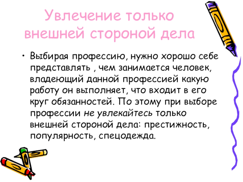 Увлечение только внешней стороной делаВыбирая профессию, нужно хорошо себе представлять , чем занимается человек, владеющий данной профессией