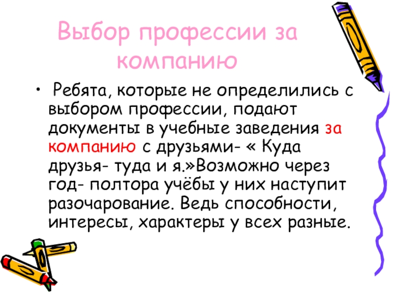 Выбор профессии за компанию Ребята, которые не определились с выбором профессии, подают документы в учебные заведения за