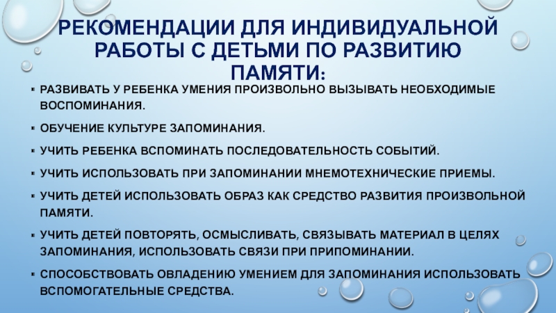 Слайд 27РЕКОМЕНДАЦИИ ДЛЯ ИНДИВИДУАЛЬНОЙ РАБОТЫ С ДЕТЬМИ ПО РАЗВИТИЮ ПАМЯТИ: