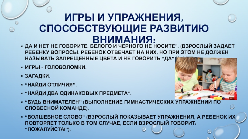 Слайд 26Игры и упражнения, способствующие развитию внимания: