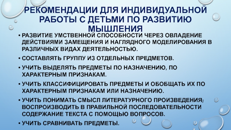 Слайд 29РЕКОМЕНДАЦИИ ДЛЯ ИНДИВИДУАЛЬНОЙ РАБОТЫ С ДЕТЬМИ ПО РАЗВИТИЮ МЫШЛЕНИЯ