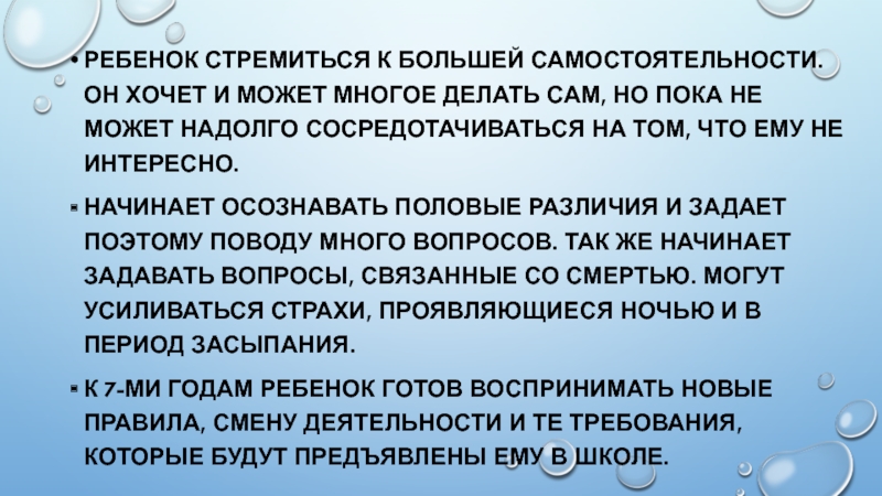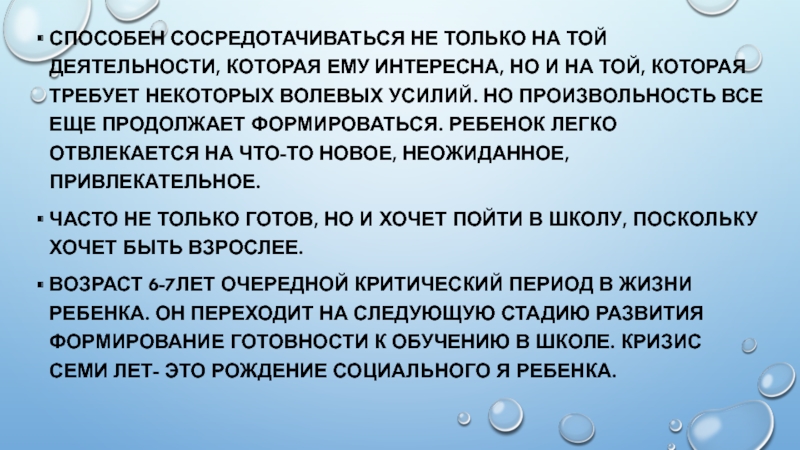 Возраст 6-7лет очередной критический период в жизни ребенка. Он переходит на следующую стадию развития формирование готовности к обучению в школе. Кризис семи лет- это рождение социального Я ребенка.