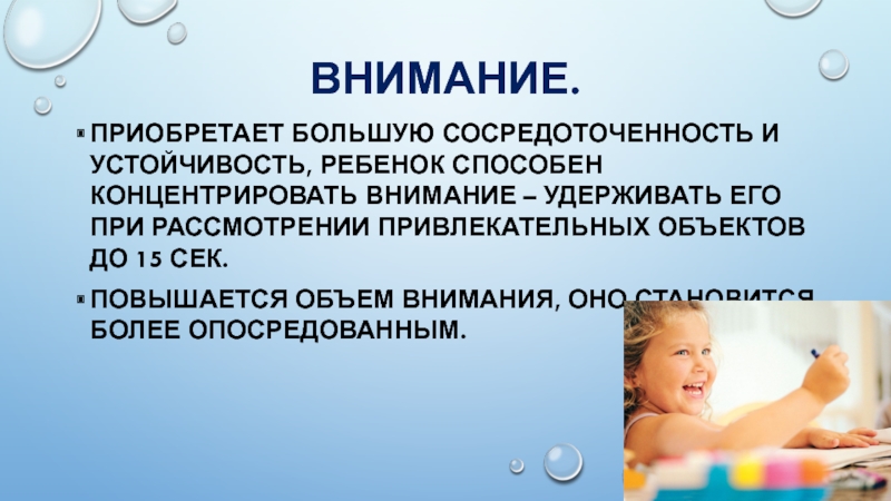 Приобретает большую сосредоточенность и устойчивость, ребенок способен концентрировать внимание – удерживать