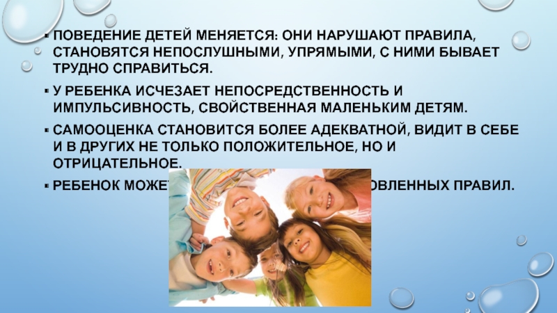 Слайд 20Поведение детей меняется: они нарушают правила, становятся непослушными, упрямыми, с ними