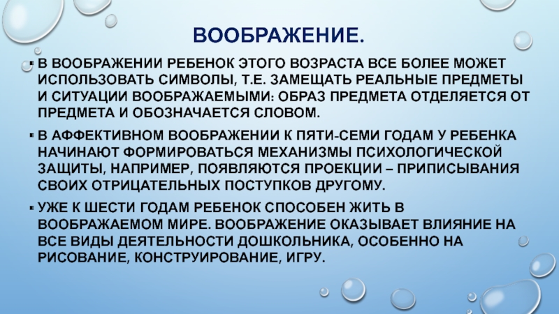 Уже к шести годам ребенок способен жить в воображаемом мире. Воображение оказывает влияние на все виды деятельности дошкольника, особенно на рисование, конструирование, игру.