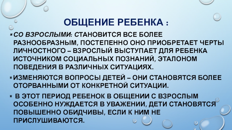 В этот период ребенок в общении с взрослым особенно нуждается в уважении, дети становятся повышенно обидчивы, если к ним не прислушиваются.