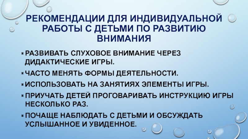 Слайд 24РЕКОМЕНДАЦИИ ДЛЯ ИНДИВИДУАЛЬНОЙ РАБОТЫ С ДЕТЬМИ ПО РАЗВИТИЮ ВНИМАНИЯ