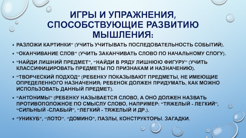 Слайд 30Игры и упражнения, способствующие развитию мышления: