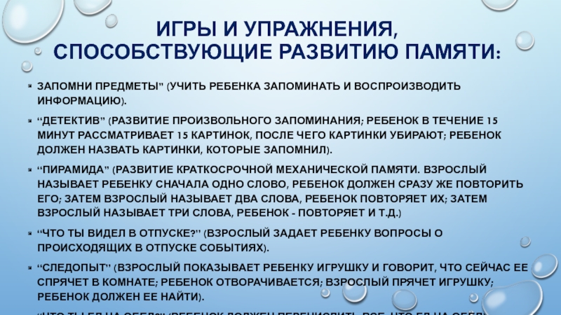 Слайд 28Игры и упражнения, способствующие развитию памяти: