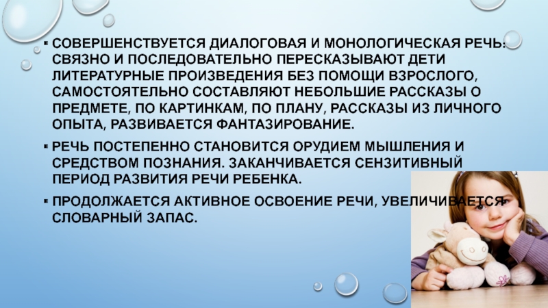 Речь постепенно становится орудием мышления и средством познания. Заканчивается сензитивный период развития речи ребенка.