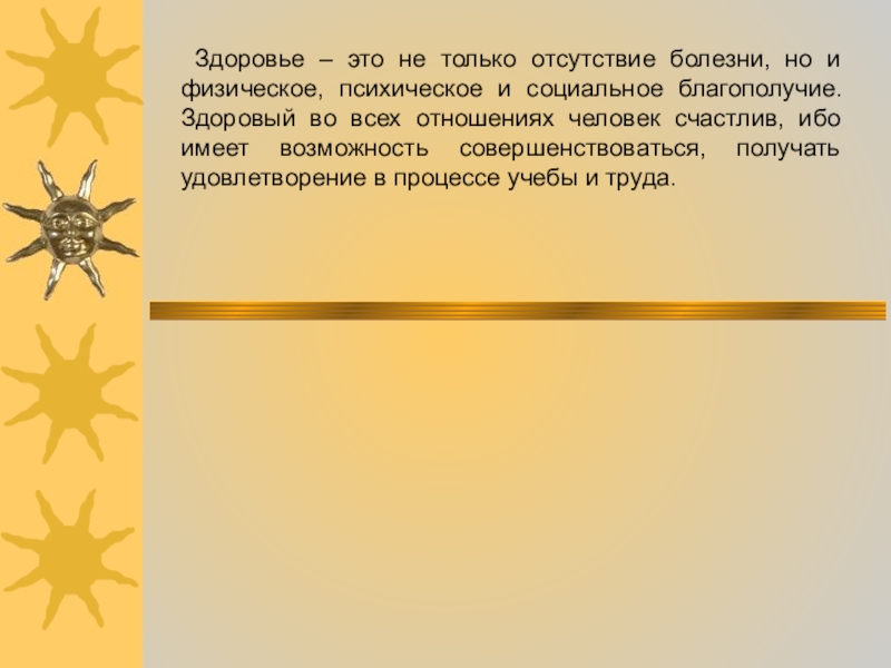 и социальное благополучие. Здоровый во всех отношениях человек счастлив, ибо имеет возможность совершенствоваться, получать удовлетворение в процессе учебы и труда.
