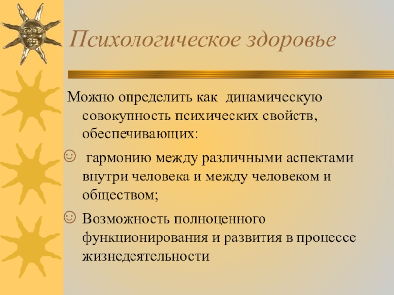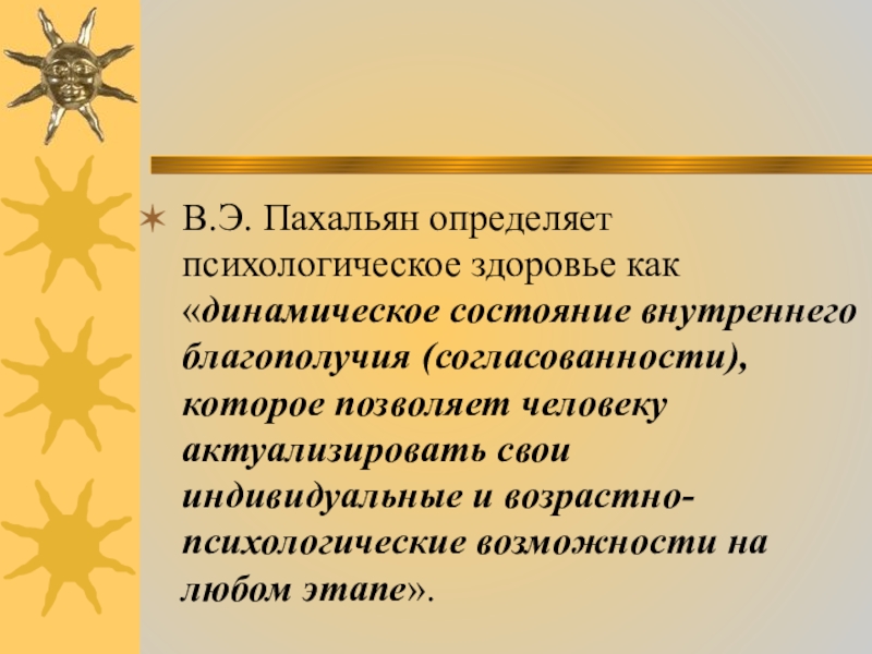 В.Э. Пахальян определяет психологическое здоровье как «динамическое состояние внутреннего благополучия (согласованности), которое