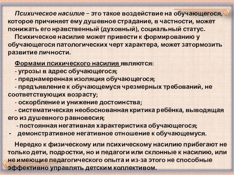 Слайд 54Психическое насилие – это такое воздействие на обучающегося, которое причиняет ему