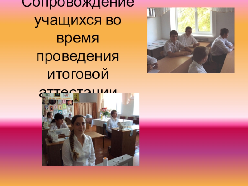 Слайд 46Сопровождение учащихся во время проведения итоговой аттестации
