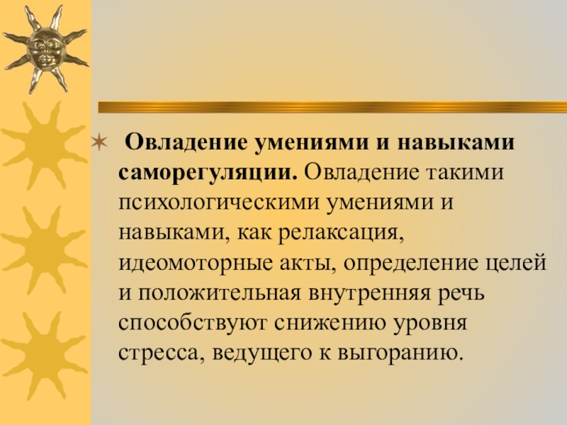 навыками, как релаксация, идеомоторные акты, определение целей и положительная внутренняя речь способствуют снижению уровня стресса, ведущего к выгоранию.