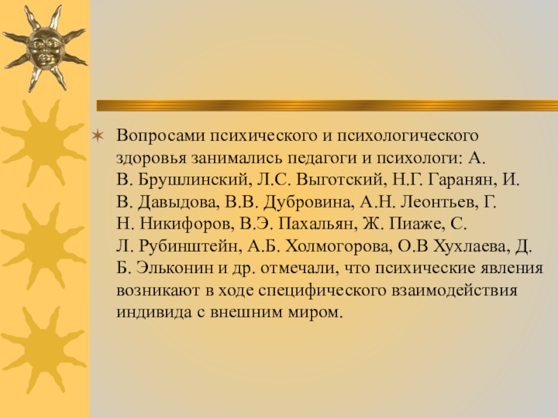 Вопросами психического и психологического здоровья занимались педагоги и психологи: А.В. Брушлинский, Л.С. Выготский,