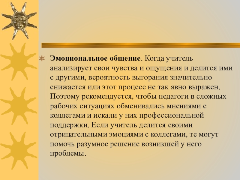 ими с другими, вероятность выгорания значительно снижается или этот процесс не так явно выражен. Поэтому рекомендуется, чтобы педагоги в сложных рабочих ситуациях обменивались мнениями с коллегами и искали у них профессиональной поддержки. Если учитель делится своими отрицательными эмоциями с коллегами, те могут помочь разумное решение возникшей у него проблемы.