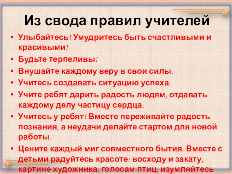 Учите ребят дарить радость людям, отдавать каждому делу частицу сердца.
