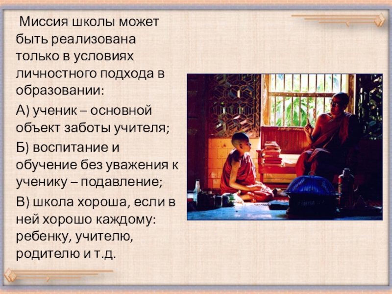 Слайд 2 Миссия школы может быть реализована только в условиях личностного подхода