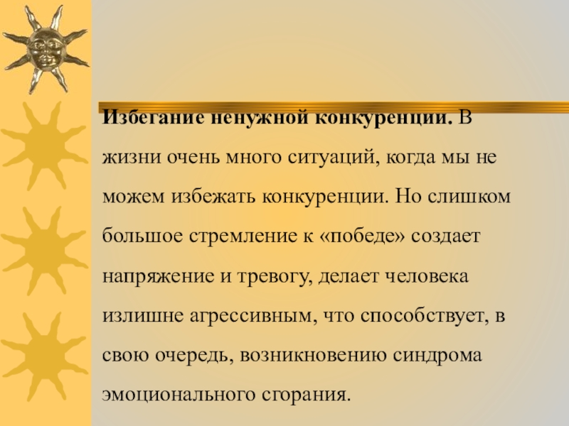 можем избежать конкуренции. Но слишком большое стремление к «победе» создает напряжение и тревогу, делает человека излишне агрессивным, что способствует, в свою очередь, возникновению синдрома эмоционального сгорания.