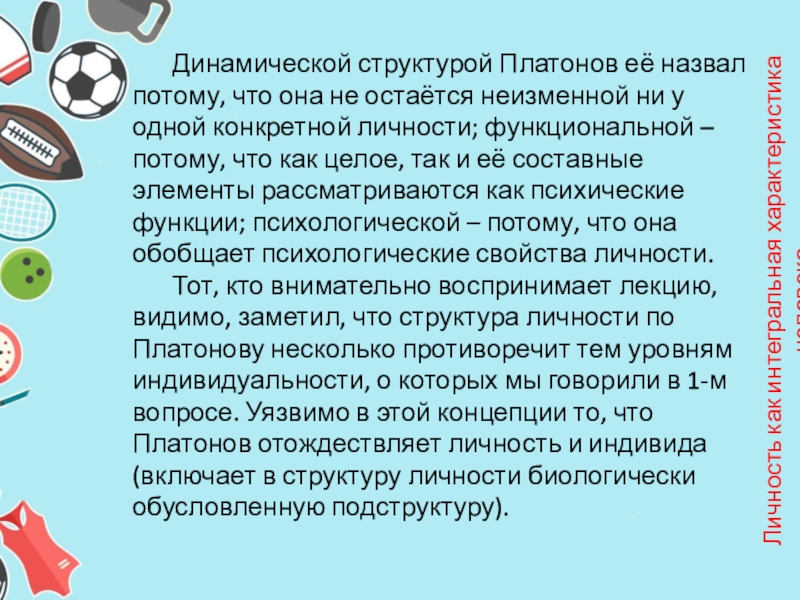 Тот, кто внимательно воспринимает лекцию, видимо, заметил, что структура личности по Платонову несколько противоречит тем уровням индивидуальности, о которых мы говорили в 1-м вопросе. Уязвимо в этой концепции то, что Платонов отождествляет личность и индивида (включает в структуру личности биологически обусловленную подструктуру).