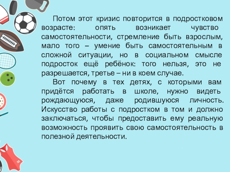 Слайд 33Потом этот кризис повторится в подростковом возрасте: опять возникает чувство самостоятельности,