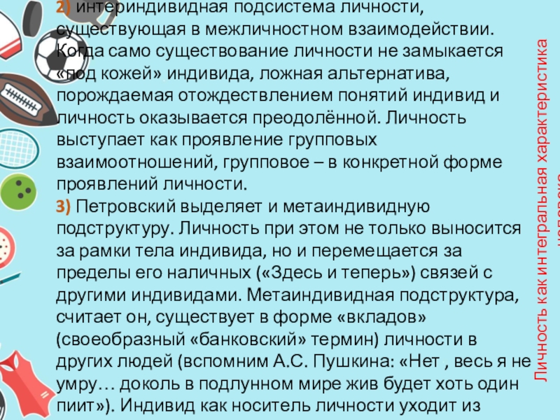 Но её недостаточно для понимания психологии личности. Дело в том, считает он, что личность не может быть заключена в некое замкнутое пространство внутри органического тела индивида. Ведь она является субъектом отношений с обществом, с группами, с другими индивидами. Поэтому выделяется…