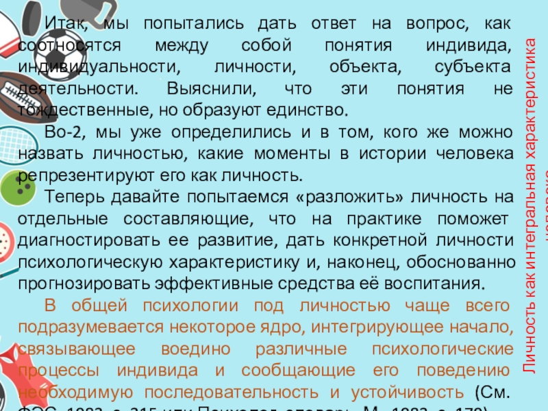 В общей психологии под личностью чаще всего подразумевается некоторое ядро, интегрирующее начало, связывающее воедино различные психологические процессы индивида и сообщающие его поведению необходимую последовательность и устойчивость (См. ФЭС, 1983, с. 315 или Психолог. словарь. М., 1983, с. 179).