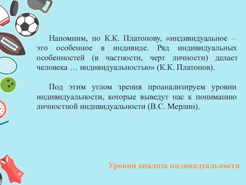 индивидуальных особенностей (в частности, черт личности) делает человека … индивидуальностью» (К.К. Платонов).