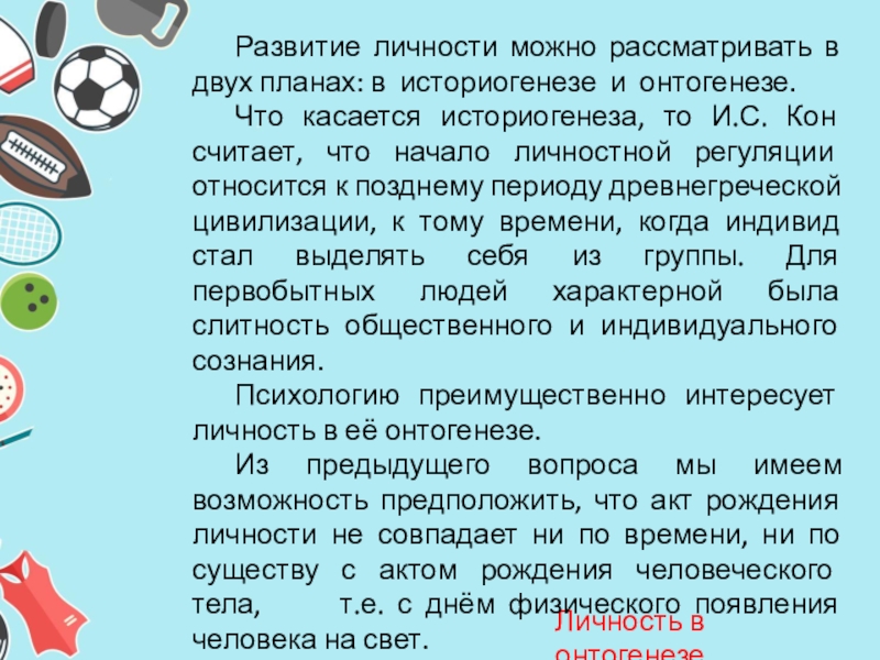 Что касается историогенеза, то И.С. Кон считает, что начало личностной регуляции относится к позднему периоду древнегреческой цивилизации, к тому времени, когда индивид стал выделять себя из группы. Для первобытных людей характерной была слитность общественного и индивидуального сознания.