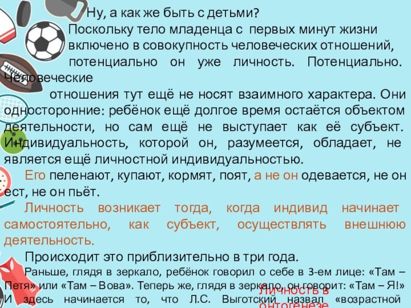отношения тут ещё не носят взаимного характера. Они односторонние: ребёнок ещё долгое время остаётся объектом деятельности, но сам ещё не выступает как её субъект. Индивидуальность, которой он, разумеется, обладает, не является ещё личностной индивидуальностью.