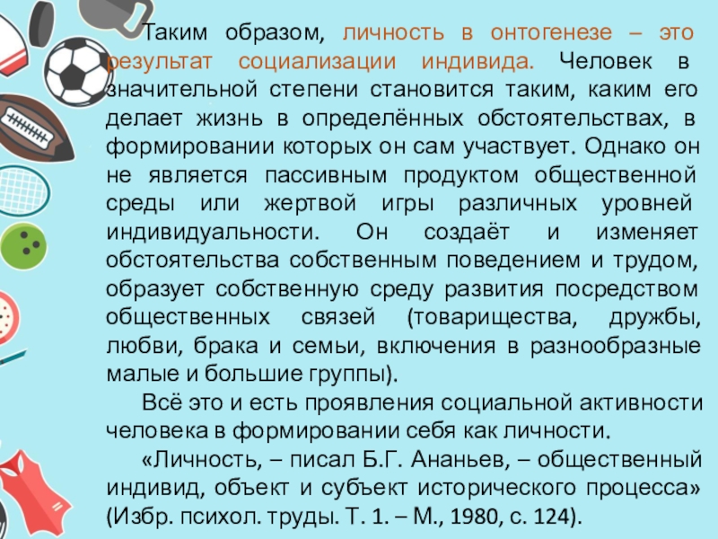 «Личность, – писал Б.Г. Ананьев, – общественный индивид, объект и субъект исторического процесса» (Избр. психол. труды. Т. 1. – М., 1980, с. 124).