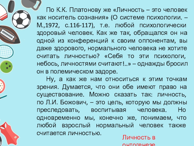 как носитель сознания» (О системе психологии. – М.,1972, с.116-117), т.е. любой психологически здоровый человек. Как же так, обращался он на одной из конференций к своим оппонентам, вы даже здорового, нормального человека не хотите считать личностью? «Себя то эти психологи, небось, личностями считают!..» – однажды бросил он в полемическом задоре.