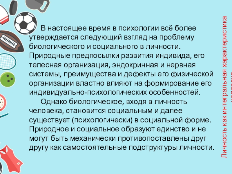 утверждается следующий взгляд на проблему биологического и социального в личности. Природные предпосылки развития индивида, его телесная организация, эндокринная и нервная системы, преимущества и дефекты его физической организации властно влияют на формирование его индивидуально-психологических особенностей.