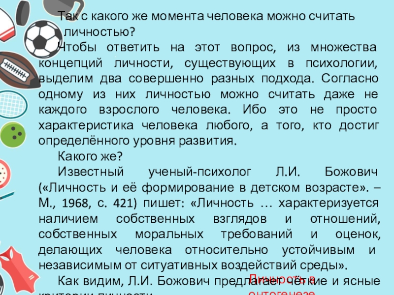 Известный ученый-психолог Л.И. Божович («Личность и её формирование в детском возрасте». – М., 1968, с. 421) пишет: «Личность … характеризуется наличием собственных взглядов и отношений, собственных моральных требований и оценок, делающих человека относительно устойчивым и независимым от ситуативных воздействий среды».