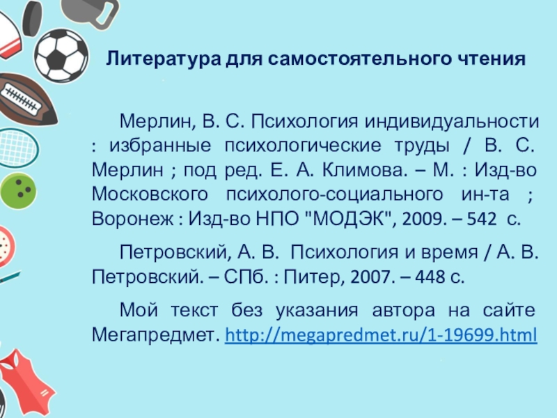 Мерлин В. С. Психология индивидуальности : избранные психологические труды / В. С. Мерлин ; под ред. Е. А. Климова. – М. : Изд-во Московского психолого-социального ин-та , 2009. – 542 с.