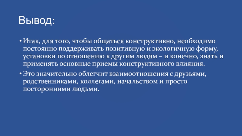 Вывод:Итак, для того, чтобы общаться конструктивно, необходимо постоянно поддерживать позитивную и экологичную форму, установки по отношению к