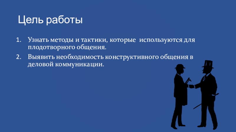 Цель работыУзнать методы и тактики, которые используются для плодотворного общения.Выявить необходимость конструктивного общения в деловой коммуникации.