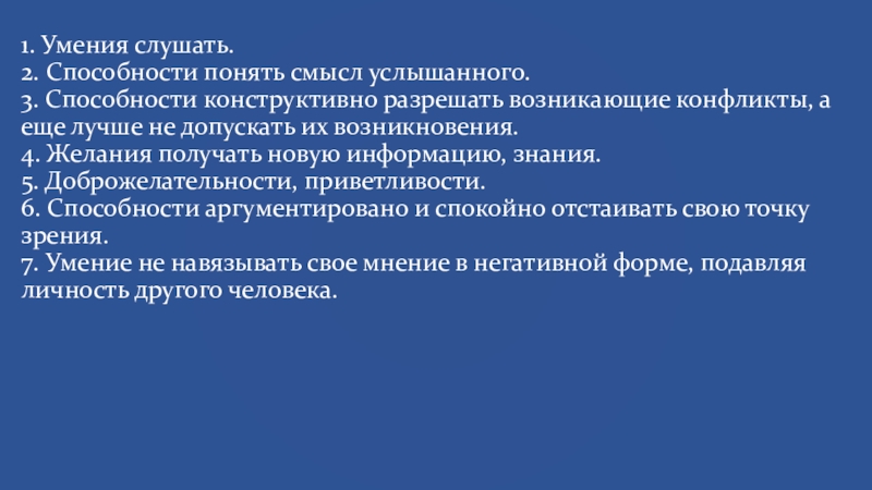 Слайд 41. Умения слушать. 2. Способности понять смысл услышанного. 3. Способности конструктивно разрешать возникающие
