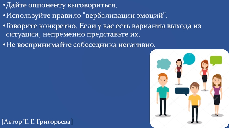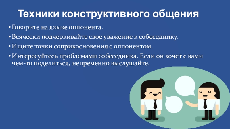 Техники конструктивного общения  Говорите на языке оппонента. Всячески подчеркивайте свое уважение к собеседнику. Ищите точки соприкосновения