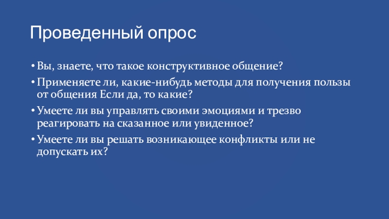 Проведенный опросВы, знаете, что такое конструктивное общение? Применяете ли, какие-нибудь методы для получения пользы от общения Если