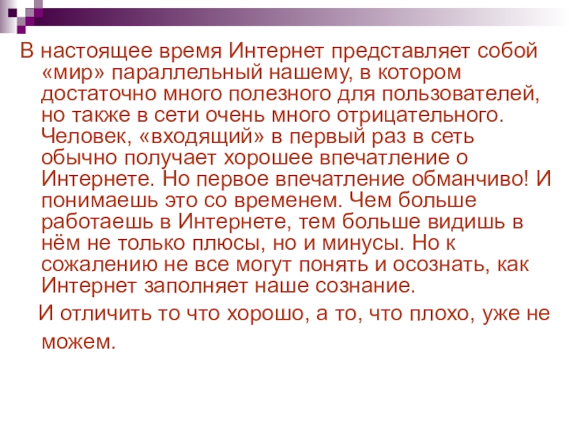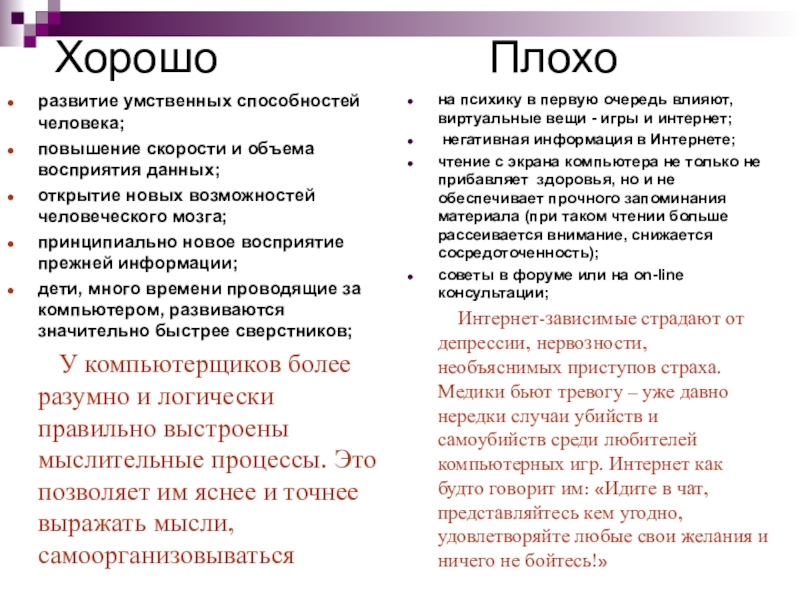 Интернет-зависимые страдают от депрессии, нервозности, необъяснимых приступов страха. Медики бьют тревогу – уже давно нередки случаи убийств и самоубийств среди любителей компьютерных игр. Интернет как будто говорит им: «Идите в чат, представляйтесь кем угодно, удовлетворяйте любые свои желания и ничего не бойтесь!»
