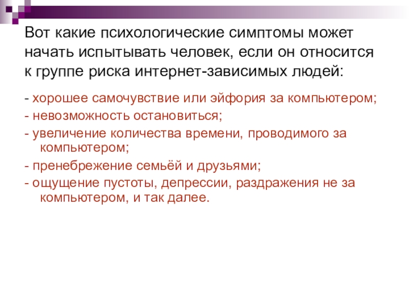 - ощущение пустоты, депрессии, раздражения не за компьютером, и так далее.