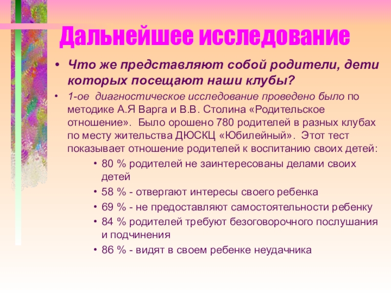 1-ое диагностическое исследование проведено было по методике А.Я Варга и В.В. Столина «Родительское отношение». Было орошено 780 родителей в разных клубах по месту жительства ДЮСКЦ «Юбилейный». Этот тест показывает отношение родителей к воспитанию своих детей: