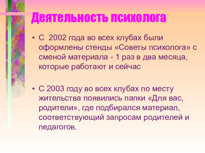 С 2003 году во всех клубах по месту жительства появились папки «Для вас, родители», где подбирался материал, соответствующий запросам родителей и педагогов.