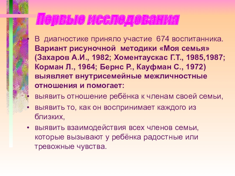семья» (Захаров А.И., 1982; Хоментаускас Г.Т., 1985,1987; Корман Л., 1964; Бернс Р., Кауфман С., 1972) выявляет внутрисемейные межличностные отношения и помогает: